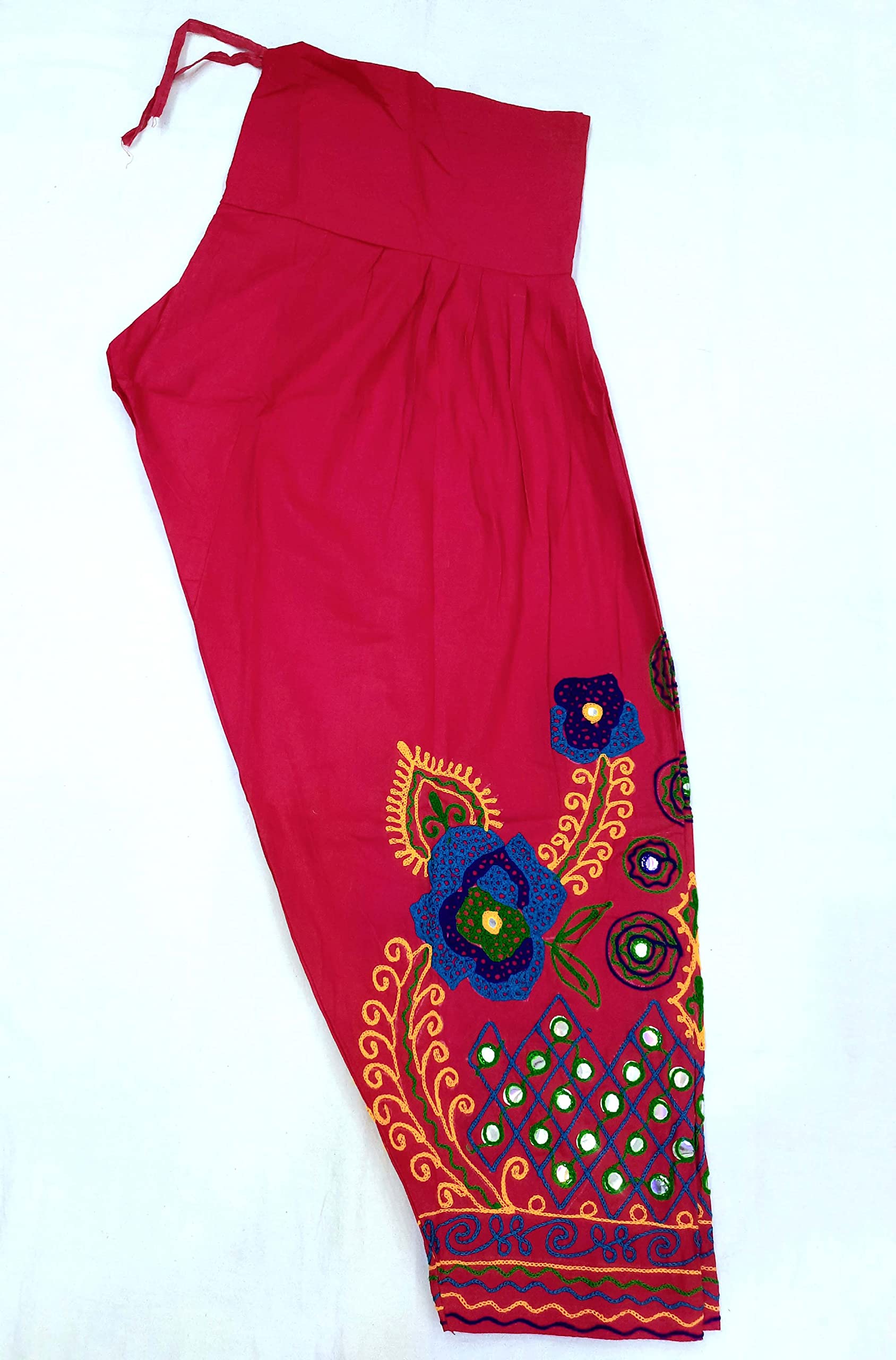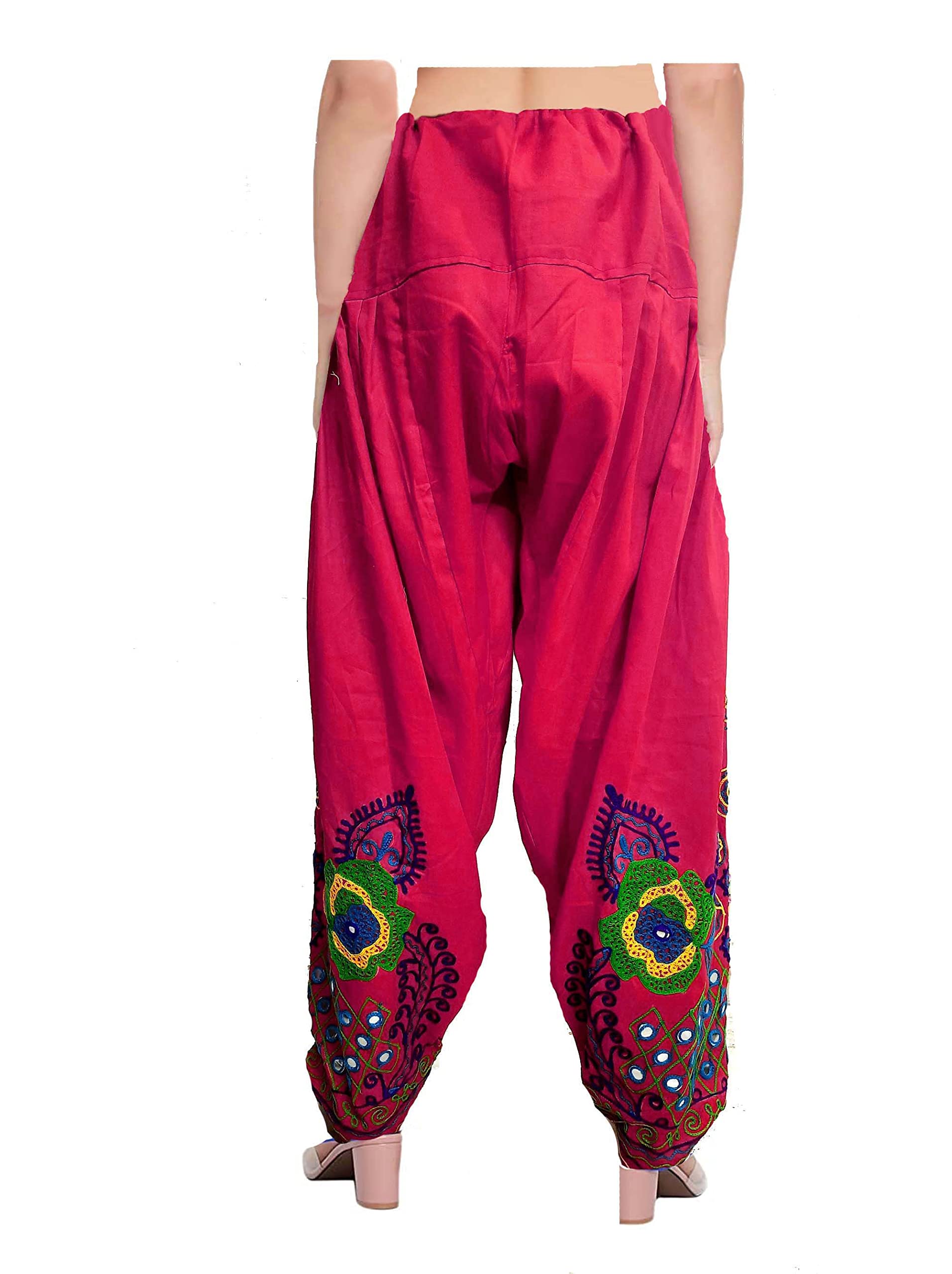 We are introducing traditional Ladies-wear embroidered patiala salwar from ethnic Theme-based Garments of Gujarat and Rajasthan. IndiaCarvan now presents salwar with matching multi-coloured Embroidery Aari work. The product is made of Cotton Fabric, which is comfortable to wear and easy to carry. These Embroidered Salwars are a huge hit among the generations, who are willing to experiment a bit. The eye-catching embroidered work and contrast colours are done on the Power Looms by our talented artisans to provide glam Quotient to the product. This can be paired up with long tops as well as short kurtis with mojris or ballerinas.