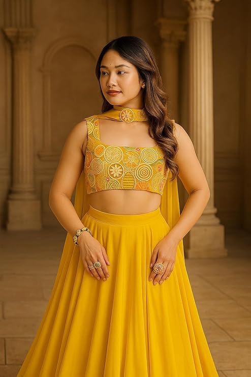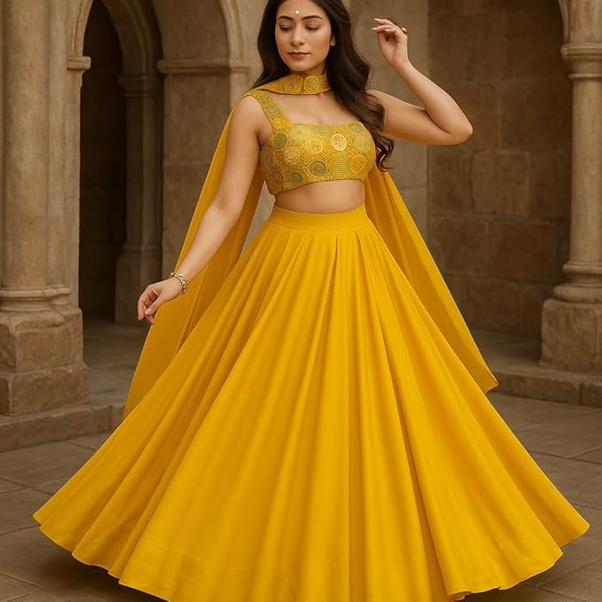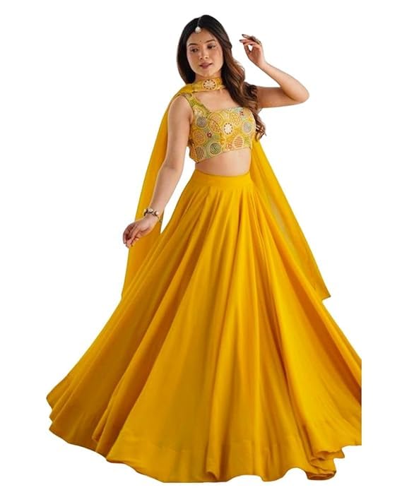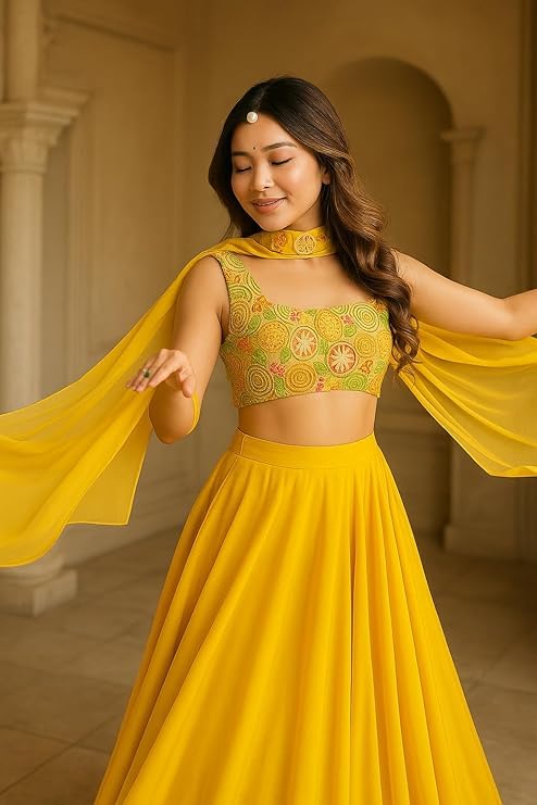 - 🎀 Complete Set: Includes lehenga, choli (blouse), and matching yellow dupatta.
