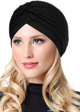 Run India Polyester Stretch Turbans Head Beanie Cover Twisted Pleated Headwrap Hair Cover Beanie Hats For Women Girls (Black), Free Size