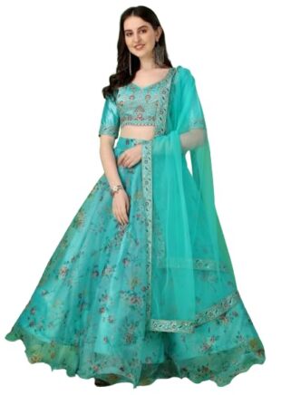 Suppar Sleave Women’s Ethnic Wear Floral Digital Printed Organza zari Sequin Work Semi-Stitched Lehenga Choli With Dupatta (Sky Blue)